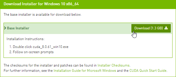 CUDA 8.0.61 (64-bit):CUDA 是一种由 NVIDIA 推出的通用并行计算架构,该架构使 GPU 能够解决复杂的计算问题,该软件包能提供 GPU 数学库、显卡驱动和 CUDA 编译器等.