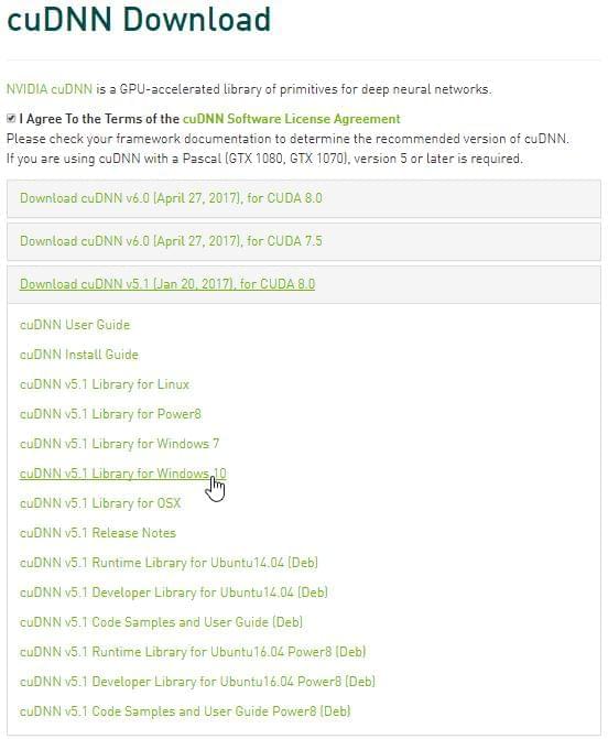 cuDNN v5.1 (Jan 20, 2017) for CUDA 8.0:用于加速卷积神经网络的运算.