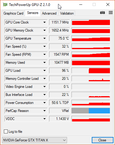 That is quite an improvement over the CPU-only version already. Without cuDNN, each epoch takes about 47s on this particular machine. If you install TechPowerUp’s GPU-Z, you can track how well the GPU is being leveraged. Here, in the case of this convnet (no cuDNN), we max out at 97% GPU usage on average: