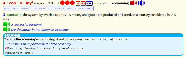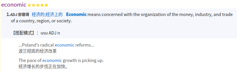这部 《Collins 双解词典》,既有中文释义,又有英文释义,并且释义全面。每一条释义会告诉你它的词性,会给出例句,排版极佳。除此之外,有的词目还会有温馨提示。比如 economic ,它会提醒你:「注意不要混淆 economic, economical, economics 和 economy」。实在是既实用又贴心。